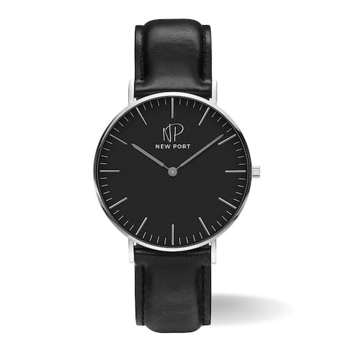 Relógio Masculino New Port Preto Pulseira De Couro Vegano Riverside Minimalista 40mm de diâmetro. A caixa é de metal prateada e o mostrador preto, vidro com mineral endurecido com alta resistência.
