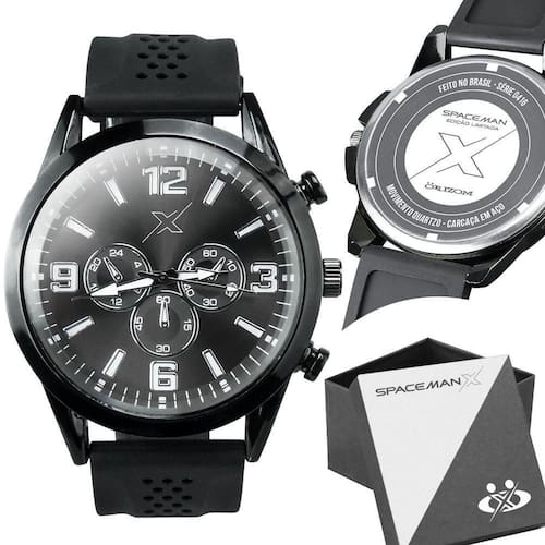 O Relógio Masculino Orizom Spaceman X possui um design moderno e elegante, com detalhes internos exclusivos, como a cor dos ponteiros e o formato dos números. Seu mostrador preto e sua pulseira ajustável de silicone preta garantem conforto e estilo. Além disso, sua tampa é blindada com uma arte exclusiva Orizom Spaceman, garantindo sua autenticidade. Com um diâmetro de cerca de 4,5 cm, este relógio é perfeito para qualquer ocasião.