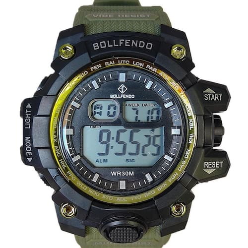 MARCA: Bollfendo Categoria: Digital Digital: Sim 1 Horário Calendário: Sim Despertador: Sim Cronômetro: Sim Luz: Sim Cor da Iluminação: Verde