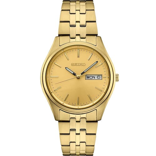 - CAIXA E PULSEIRA DE AÇO INOXIDÁVEL DOURADO: duráveis e elegantes, a caixa e a pulseira de aço inoxidável dourado conferem longevidade e elegância a este luxuoso relógio de campo SEIKO QUALITY: relógios feitos à mão para todas as ocasiões