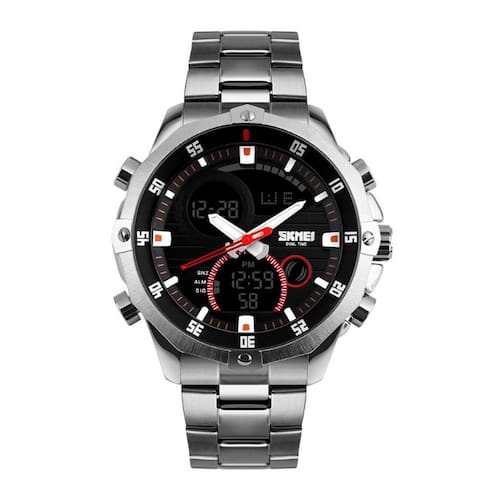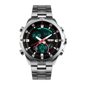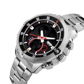 Relógio Masculino Skmei AnaDigi 1146 Prata e PretoMarca: Skmei Categoria: AnaDigi Analógico: Sim (1 Horário) Ponteiros Fluorescentes: Sim Digital: Sim (1 Horário) Calendário: Sim Despertador: Sim Mostra o Dia da Semana: Sim Mostra o Dia do Mês: Sim Cronômetro: Sim Contador Regressivo: Não Luz: Sim Cor da Iluminação: VerdeResistente à Água: 3 ATM (Resiste a imersões breves) - Respingos: Sim - Chuva: Sim - Lavar Carro: Sim - Lavar Louça: Sim - Natação: Não - Mergulho: Não Característica do Vidro: Cristal Mineral Tipo de Fecho: Dobrável com Botão Cor da Caixa: Prata Material da Caixa: Metal Banho IP Formato da Caixa: Redondo Diâmetro da Caixa: 44,60 (mm) Espessura da Caixa: 16,00 (mm) Cor da Pulseira: Prata Material da Pulseira: Aço Largura da Pulseira: 20,00 (mm) Comprimento Máximo da Pulseira: 240,00 (mm) Alimentação: Bateria Interna Peso Líquido: 0,150 Kg Modelo: 1146 Cor Predominante: Prata Cor Diferencial: Preto Garantia: 12 MesesConteúdo da Embalagem: 01 Relógio 01 Embalagem 01 Termo de Garantia