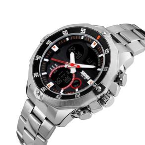 Relógio Masculino Skmei AnaDigi 1146 Prata e Preto Relógio Masculino Skmei AnaDigi 1146 Prata e Preto Marca: Skmei Categoria: AnaDigi Analógico: Sim 1 Horário Ponteiros Fluorescentes: Sim Digital: Sim 1 Horário Calendário: Sim Despertador: Sim Mostra o Dia da Semana: Sim Mostra o Dia do Mês: Sim Cronômetro: Sim Contador Regressivo: Não Luz: Sim Cor da Iluminação: Verde Resistente à Água: 3 ATM Resiste a imersões breves - Respingos: Sim - Chuva: Sim - Lavar Carro: Sim - Lavar Louça: Sim - Natação: Não - Mergulho: Não Característica do Vidro: Cristal Mineral Tipo de Fecho: Dobrável com Botão Cor da Caixa: Prata Material da Caixa: Metal Banho IP Formato da Caixa: Redondo Diâmetro da Caixa: 44,60 mm Espessura da Caixa: 16,00 mm Cor da Pulseira: Prata Material da Pulseira: Aço Largura da Pulseira: 20,00 mm Comprimento Máximo da Pulseira: 240,00 mm Alimentação: Bateria Interna Peso Líquido: 0,150 Kg Modelo: 1146 Cor Predominante: Prata Cor Diferencial: Preto : 12 Meses Conteúdo da Embalagem: 01 Relógio 01 Embalagem 01 Termo de Marca: Não Informado Ean: 7896575100138