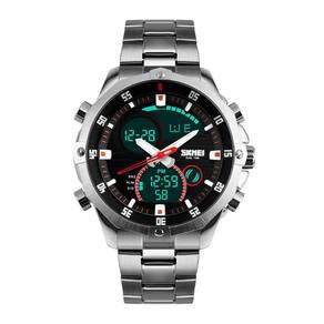Relógio Masculino Skmei AnaDigi 1146 Prata e Preto Relógio Masculino Skmei AnaDigi 1146 Prata e Preto Marca: Skmei Categoria: AnaDigi Analógico: Sim 1 Horário Ponteiros Fluorescentes: Sim Digital: Sim 1 Horário Calendário: Sim Despertador: Sim Mostra o Dia da Semana: Sim Mostra o Dia do Mês: Sim Cronômetro: Sim Contador Regressivo: Não Luz: Sim Cor da Iluminação: Verde Resistente à Água: 3 ATM Resiste a imersões breves - Respingos: Sim - Chuva: Sim - Lavar Carro: Sim - Lavar Louça: Sim - Natação: Não - Mergulho: Não Característica do Vidro: Cristal Mineral Tipo de Fecho: Dobrável com Botão Cor da Caixa: Prata Material da Caixa: Metal Banho IP Formato da Caixa: Redondo Diâmetro da Caixa: 44,60 mm Espessura da Caixa: 16,00 mm Cor da Pulseira: Prata Material da Pulseira: Aço Largura da Pulseira: 20,00 mm Comprimento Máximo da Pulseira: 240,00 mm Alimentação: Bateria Interna Peso Líquido: 0,150 Kg Modelo: 1146 Cor Predominante: Prata Cor Diferencial: Preto : 12 Meses Conteúdo da Embalagem: 01 Relógio 01 Embalagem 01 Termo de Marca: Não Informado Ean: 7896575100138
