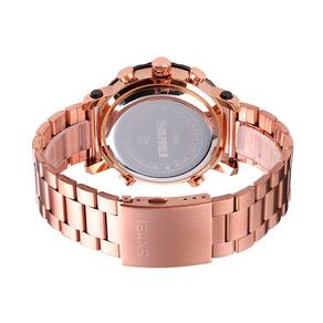 Relógio Masculino Skmei AnaDigi 1636 - Rose e Preto Marca: Skmei Categoria: AnaDigi Analógico: Sim (1 Horário) Ponteiros Fluorescentes: Sim Digital: Sim (1 Horário) Calendário: Sim Despertador: Sim Mostra o Dia da Semana: Sim Mostra o Dia do Mês: Sim Cronômetro: Sim Contador Regressivo: Sim Luz: Sim Cor da Iluminação: Verde Resistente à Água: 3 ATM (Resiste a imersões breves) - Respingos: Sim - Chuva: Sim - Lavar Carro: Sim - Lavar Louça: Sim - Natação: Não - Mergulho: Não Característica do Vidro: Cristal Mineral Tipo de Fecho: Dobrável com Botão Cor da Caixa: Rose Material da Caixa: Metal Banho IP Formato da Caixa: Redondo Diâmetro da Caixa: 46,70 (mm) Espessura da Caixa: 16,20 (mm) Cor da Pulseira: Rose Material da Pulseira: Aço Largura da Pulseira: 24,00 (mm) Comprimento Máximo da Pulseira: 240,00 (mm) Alimentação: Bateria Interna Peso Líquido: 0,174 Kg Modelo: 1636 Cor Predominante: Rose Cor Diferencial: Preto Garantia: 12 Meses