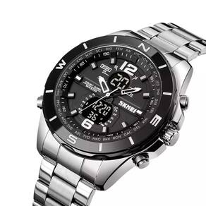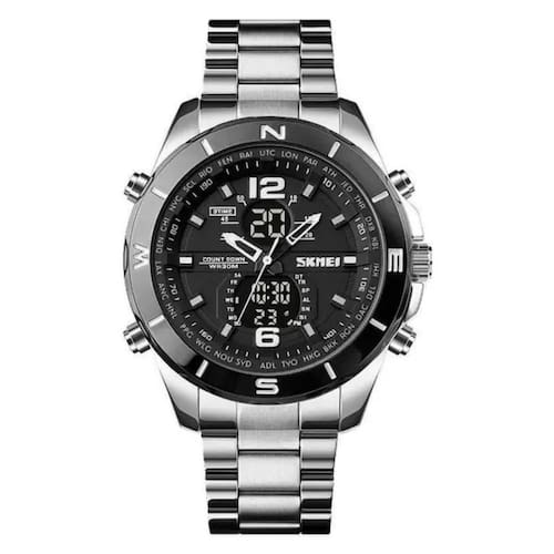 Relógio Masculino Skmei AnaDigi 1670 Prata e Preto Relógio Masculino Skmei AnaDigi 1670 Prata e Preto Marca: Skmei Categoria: AnaDigi Analógico: Sim 1 Horário Ponteiros Fluorescentes: Selecione Digital: Sim 1 Horário Despertador: Sim Contador Regressivo: Sim Luz: Sim Cor da Iluminação: Verde Resistente à Água: 3 ATM Resiste a imersões breves - Respingos: Sim - Chuva: Sim - Lavar Carro: Sim - Lavar Louça: Sim - Natação: Não - Mergulho: Não Característica do Vidro: Cristal Mineral Tipo de Fecho: Dobrável com Botão Cor da Caixa: Prata Material da Caixa: Metal Banho IP Formato da Caixa: Redondo Diâmetro da Caixa: 45,00 mm Espessura da Caixa: 16,00 mm Cor da Pulseira: Prata Material da Pulseira: Aço Largura da Pulseira: 19,00 mm Comprimento Máximo da Pulseira: 280,00 mm Alimentação: Bateria Interna Peso Líquido: 0,150 Kg Modelo: 1670 Cor Predominante: Prata Cor Diferencial: Preto : 12 Meses Conteúdo da Embalagem: 01 Relógio 01 Embalagem 01 Termo de
