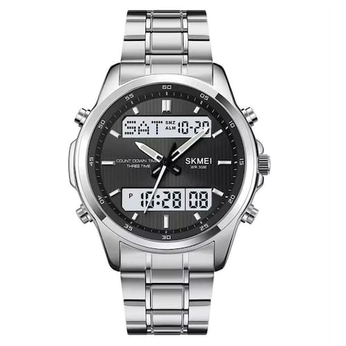 Relógio Masculino Skmei AnaDigi 2049 Prata Relógio Masculino Skmei AnaDigi 2049 Prata Marca: Skmei Categoria: AnaDigi Analógico: Sim 1 Horário Ponteiros Fluorescentes: Sim Digital: Sim 1 Horário Calendário: Sim Despertador: Sim Mostra o Dia da Semana: Sim Mostra o Dia do Mês: Sim Cronômetro: Sim Contador Regressivo: Sim Luz: Sim Cor da Iluminação: Azul Resistente à Água: 3 ATM Resiste a imersões breves - Respingos: Sim - Chuva: Sim - Lavar Carro: Sim - Lavar Louça: Sim - Natação: Não - Mergulho: Não Característica do Vidro: Cristal Mineral Tipo de Fecho: Dobrável com Botão Cor da Caixa: Prata Material da Caixa: Metal Banho IP Formato da Caixa: Redondo Diâmetro da Caixa: 41,50 mm Espessura da Caixa: 14,00 mm Cor da Pulseira: Prata Material da Pulseira: Metal Largura da Pulseira: 20,00 mm Comprimento Máximo da Pulseira: 230,00 mm Alimentação: Bateria Interna Peso Líquido: 0,130 Kg Modelo: 2049 Cor Predominante: Prata : 12 Meses Conteúdo da Embalagem: 01 Relógio 01 Embalagem 01 Termo de Marca: Não Informado