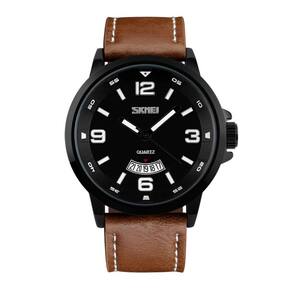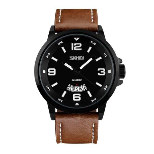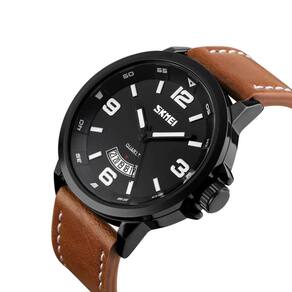 Relógio Masculino Skmei Analógico 9115 - Marrom e Preto Marca: Skmei Categoria: Analógico Analógico: Sim (1 Horário) Ponteiros Fluorescentes: Sim Digital: Não Calendário: Sim Despertador: Não Mostra o Dia da Semana: Não Mostra o Dia do Mês: Sim Cronômetro: Não Contador Regressivo: Não Luz: Não Resistente à Água: 3 ATM (Resiste a imersões breves) - Respingos: Sim - Chuva: Sim - Lavar Carro: Sim - Lavar Louça: Sim - Natação: Não - Mergulho: Não Característica do Vidro: Cristal Mineral Tipo de Fecho: Fivela Cor da Caixa: Preto Material da Caixa: Metal Banho IP Formato da Caixa: Redondo Diâmetro da Caixa: 46,60 (mm) Espessura da Caixa: 13,30 (mm) Cor da Pulseira: Marrom Material da Pulseira: Couro Largura da Pulseira: 24,30 (mm) Comprimento Máximo da Pulseira: 230,00 (mm) Alimentação: Bateria Interna Peso Líquido: 0,076 Kg Modelo: 9115 Cor Predominante: Marrom Cor Diferencial: Preto Garantia: 12 Meses