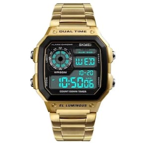 Marca: Skmei Categoria: Digital Analógico: Não Digital: Sim (1 Horário) Calendário: Sim Despertador: Sim Mostra o Dia da Semana: Sim Mostra o Dia do Mês: Sim Cronômetro: Sim Contador Regressivo: Sim Luz: Sim Cor da Iluminação: Verde Resistente à Água: 5 ATM - Respingos: Sim - Chuva: Sim - Lavar Carro: Sim - Lavar Louça: Sim - Natação: Sim - Mergulho: Não Característica do Vidro: Acrílico Tipo de Fecho: Dobrável com Botão Cor da Caixa: Dourado Material da Caixa: Plástico Formato da Caixa: Quadrado Comprimento da Caixa: 45,00 (mm) Largura da Caixa: 40,00 (mm) Espessura da Caixa: 13,40 (mm) Cor da Pulseira: Dourado Material da Pulseira: Aço Largura da Pulseira: 18,00 (mm) Comprimento Máximo da Pulseira: 230,00 (mm) Alimentação: Bateria Interna Peso Líquido: 0,090 Kg Modelo: 1335 Cor Predominante: Dourado Garantia: 12 Meses