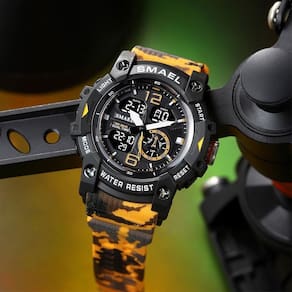 Relógio Masculino Smael AnaDigi 8007 Laranja Camuflado e Preto Relógio Masculino Smael AnaDigi 8007 Laranja Camuflado e Preto Marca: Smael Categoria: AnaDigi ógico: Sim 1 Horário Ponteiros Fluorescentes: Sim Digital: Sim 1 Horário Calendário: Sim Despertador: Sim Mostra o Dia da Semana: Sim Mostra o Dia do Mês: Sim Cronômetro: Sim Contador Regressivo: Não Luz: Sim Cor da Iluminação: Azul Resistente à Água: 5 ATM Pode ser para nadar no raso, por pouco tempo submerso - Respingos: Sim - Chuva: Sim - Lavar Carro: Sim - Lavar Louça: Sim - Natação: Sim - Mergulho: Não Característica do Vidro: Acrílico Tipo de Fecho: Fivela Cor da Caixa: Preto Material da Caixa: Plástico Formato da Caixa: Redondo Diâmetro da Caixa: 53,00 mm Espessura da Caixa: 18,00 mm Cor da Pulseira: Camuflado Material da Pulseira: Borracha Largura da Pulseira: 22,00 mm Comprimento Máximo da Pulseira: 240,00 mm Alimentação: Bateria Interna Peso Líquido: 0,070 Kg Modelo: 8007MC Cor Predominante: Laranja Cor Diferencial: Preto : 12 Meses Conteúdo da Embalagem: 01 Relógio 01 Embalagem 01 Termo de Marca: Não Informado