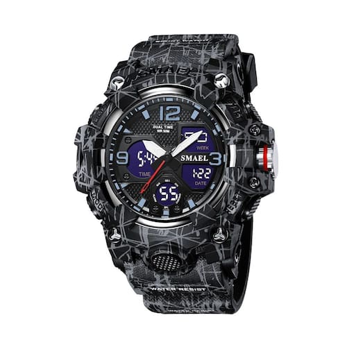 Marca: Smael Categoria: AnaDigi Analógico: Sim (1 Horário) Ponteiros Fluorescentes: Sim Digital: Sim (1 Horário) Calendário: Sim Despertador: Sim Mostra o Dia da Semana: Sim Mostra o Dia do Mês: Sim Cronômetro: Sim Contador Regressivo: Não Luz: Sim Cor da Iluminação: Azul Resistente à Água: 5 ATM - Respingos: Sim - Chuva: Sim - Lavar Carro: Sim - Lavar Louça: Sim - Natação: Sim - Mergulho: Não Característica do Vidro: Acrílico Tipo de Fecho: Fivela Cor da Caixa: Preto Material da Caixa: Plástico Formato da Caixa: Redondo Diâmetro da Caixa: 55,00 (mm) Espessura da Caixa: 18,00 (mm) Cor da Pulseira: Preto Material da Pulseira: Borracha Largura da Pulseira: 21,50 (mm) Comprimento Máximo da Pulseira: 240,00 (mm) Alimentação: Bateria Interna Peso Líquido: 0,074 Kg Modelo: 8008MC Cor Predominante: Preto Garantia: 12 Meses
