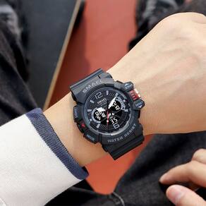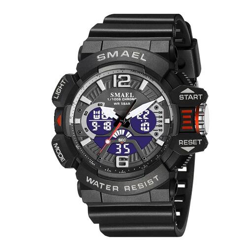 Marca: Smael Categoria: AnaDigi Analógico: Sim (1 Horário) Ponteiros Fluorescentes: Não Digital: Sim (1 Horário) Calendário: Sim Despertador: Sim Mostra o Dia da Semana: Sim Mostra o Dia do Mês: Sim Cronômetro: Sim Contador Regressivo: Não Luz: Sim Cor da Iluminação: Azul Resistente à Água: 5 ATM - Respingos: Sim - Chuva: Sim - Lavar Carro: Sim - Lavar Louça: Sim - Natação: Sim - Mergulho: Não Característica do Vidro: Acrílico Tipo de Fecho: Fivela Cor da Caixa: Preto Material da Caixa: Plástico Formato da Caixa: Redondo Diâmetro da Caixa: 50,00 (mm) Espessura da Caixa: 18,00 (mm) Cor da Pulseira: Preto Material da Pulseira: Borracha Largura da Pulseira: 22,00 (mm) Comprimento Máximo da Pulseira: 250,00 (mm) Alimentação: Bateria Interna Peso Líquido: 0,060 Kg Modelo: 8065 Cor Predominante: Preto Garantia: 12 Meses