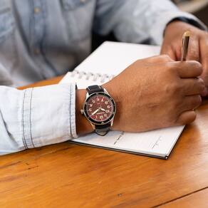 Este relógio analógico apresenta um mostrador vinho com efeito metálico, destacando-se pela numeração completa e marcações na catraca. A caixa cromada, com catraca serrilhada nas laterais, confere um design elegante e moderno. Com 4,2 cm de diâmetro, oferece um excelente ajuste ao pulso. A pulseira preta em couro autêntico, com detalhes em pespontos, e o fecho fivela garantem um ajuste seguro e confortável. Ideal para quem busca estilo, durabilidade e funcionalidade.