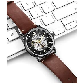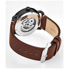 O design simplificado encontra uma execução ousada no Mantra, um relógio automático sob medida criado com estilo em mente. Tamanho da caixa 42mm Mantenha seu tempo livre com ponteiros luminosos no estilo de seringa, algarismos arábicos e marcadores de índice contidos em uma impressionante moldura de aço inoxidável polido. Um poderoso movimento automático está em exibição total no mostrador esqueletizado e no fundo da caixa da exposição. Acabado com uma pulseira de couro de com costura contrastante, combinando estilo elegante e conforto superior