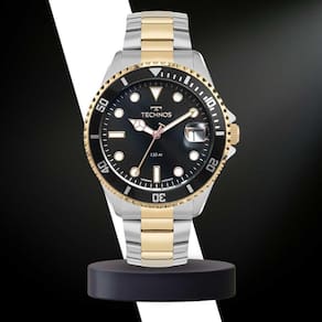 Relógio Masculino Technos Acqua Analógico 2415DX/1P Prata A linha Acqua com o clássico design para mergulho. Ele possui elementos indispensáveis para aventuras submersas, como o aro externo giratório com acabamento corrugado e lente antireflexo com lupa de calendário, além do mostrador com ponteiros e marcadores de hora luminescentes. Seu mostrador ainda conta com um acabamento degradê colorido e formas geométricas nos marcadores de hora. Produto em aço inoxidável, com máquina quartz japonesa, calendário e resistência à água de até 15 ATM. Características:ean: 7891530824616Marca: TechnosModelo: 2415DX/1PCor da Caixa: PrataCor da Pulseira: Dourado e prataMaterial da Caixa: MetalMaterial da Pulseira: AçoCor do Mostrador: PretoResistência à água: 15 ATMMecanismo: AnalógicoFunções: Calendário com dataDimensões da Embalagem:Altura: 8cmLargura: 12cmProfundidade: 16cmPeso: 0,400KgGarantia: 12 Meses