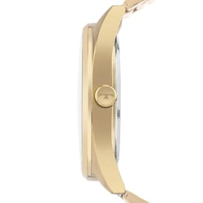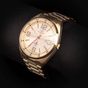 Tipo: Analógico Material da caixa: Aço Cor da caixa: Dourado Largura da caixa: 4,6 cm Cor do mostrador: Dourado Material da pulseira: Aço Cor da pulseira: Dourado Comprimento da pulseira: 23 cm aprox. Tipo de fecho: Trava lateral Resistência à água: 5 ATM 50 metros Ean: 7891530768248