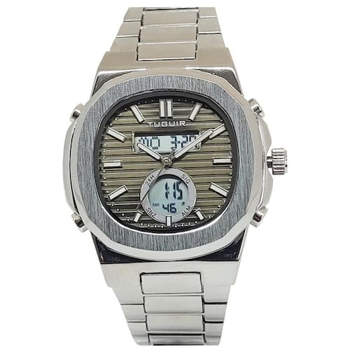 Relógio Masculino Tuguir AnaDigi TG3033 Prata Relógio Masculino Tuguir AnaDigi TG3033 Prata Marca: Tuguir Categoria: AnaDigi Analógico: Sim 1 Horário Ponteiros Fluorescentes: Sim Digital: Sim 1 Horário Calendário: Sim Despertador: Sim Mostra o Dia da Semana: Sim Mostra o Dia do Mês: Sim Cronômetro: Sim Contador Regressivo: Sim Luz: Sim Cor da Iluminação: Resistente à Água: 3 ATM Resiste a imersões breves - Respingos: Sim - Chuva: Sim - Lavar Carro: Sim - Lavar Louça: Sim - Natação: Não - Mergulho: Não Característica do Vidro: Cristal Mineral Tipo de Fecho: Dobrável com Botão e Trava Cor da Caixa: Prata Material da Caixa: Metal Banho IP Formato da Caixa: Redondo Diâmetro da Caixa: 42,00 mm Espessura da Caixa: 13,00 mm Cor da Pulseira: Prata Material da Pulseira: Aço Largura da Pulseira: 18,00 mm Comprimento Máximo da Pulseira: 210,00 mm Alimentação: Bateria Interna Peso Líquido: 0,110 Kg Modelo: TG3033 Cor Predominante: Prata Garantia: 12 Meses