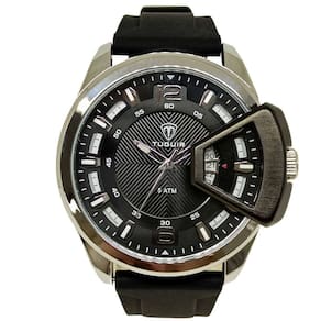 Marca: Tuguir Categoria: Analógico Analógico: Sim (1 Horário) Ponteiros Fluorescentes: Selecione Digital: Não Mostra o Dia do Mês: Sim Luz: Selecione Resistente à Água: 5 ATM - Respingos: Sim - Chuva: Sim - Lavar Carro: Sim - Lavar Louça: Sim - Natação: Sim - Mergulho: Não Característica do Vidro: Cristal Mineral Tipo de Fecho: Fivela Cor da Caixa: Prata Material da Caixa: Metal Banho IP Formato da Caixa: Redondo Diâmetro da Caixa: 48,00 (mm) Espessura da Caixa: 12,00 (mm) Cor da Pulseira: Preto Material da Pulseira: Borracha Largura da Pulseira: 19,50 (mm) Comprimento Máximo da Pulseira: 260,00 (mm) Alimentação: Bateria Interna Peso Líquido: 0,090 Kg Modelo: 2397 Cor Predominante: Prata Cor Diferencial: Preto Garantia: 12 Meses