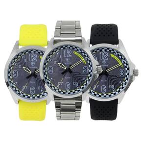 Marca: Tuguir Categoria: Analógico Analógico: Sim (1 Horário) Ponteiros Fluorescentes: Não Digital: Não Luz: Não Resistente à Água: 5 ATM - Respingos: Sim - Chuva: Sim - Lavar Carro: Sim - Lavar Louça: Sim - Natação: Sim - Mergulho: Não Característica do Vidro: Cristal Mineral Tipo de Fecho: Dobrável com Botão Cor da Caixa: Prata Material da Caixa: Metal Banho IP Formato da Caixa: Redondo Diâmetro da Caixa: 44,00 (mm) Espessura da Caixa: 9,50 (mm) Cor da Pulseira: Prata (Aço), Amarelo e Preto Material da Pulseira: Aço Largura da Pulseira: 19,50 (mm) Comprimento Máximo da Pulseira: 230,00 (mm) Alimentação: Bateria Interna Peso Líquido: 0,090 Kg Modelo: TG35135 Cor Predominante: Prata Cor Diferencial: Cinza Garantia: 12 Meses