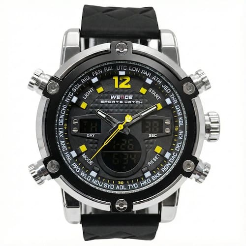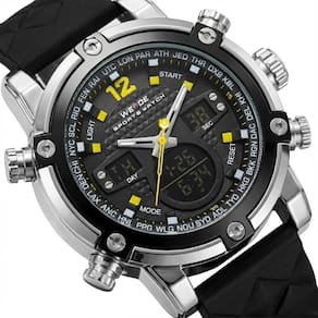 Relógio Masculino Weide AnaDigi WH-5205 Prata e Preto e AmareloMarca: Weide Categoria: AnaDigi Analógico: Sim (1 Horário) Ponteiros Fluorescentes: Selecione Digital: Sim (1 Horário) Despertador: Sim Mostra o Dia da Semana: Sim Mostra o Dia do Mês: Sim Cronômetro: Sim Luz: Sim Cor da Iluminação: VerdeResistente à Água: 3 ATM (Resiste a imersões breves) - Respingos: Sim - Chuva: Sim - Lavar Carro: Sim - Lavar Louça: Sim - Natação: Não - Mergulho: Não Característica do Vidro: Cristal Mineral Tipo de Fecho: Fivela Cor da Caixa: Prata Material da Caixa: Metal Banho IP Formato da Caixa: Redondo Diâmetro da Caixa: 49,50 (mm) Espessura da Caixa: 18,00 (mm) Cor da Pulseira: Preto Material da Pulseira: Silicone Largura da Pulseira: 23,50 (mm) Comprimento Máximo da Pulseira: 250,00 (mm) Alimentação: Bateria Interna Peso Líquido: 0,130 Kg Modelo: WH-5205 Cor Predominante: Prata Cor Diferencial: Preto e Amarelo Garantia: 12 MesesConteúdo da Embalagem: 01 Relógio 01 Embalagem 01 Termo de Garantia
