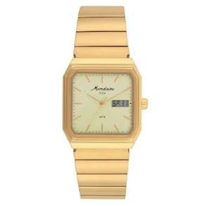Relógio Mondaine 32889GPMVDA1 Dourado Mondaine 70 Anos Masculino Anadigi A Linha 1954 da Mondaine reafirma a tradição da marca em unir design elegante e tecnologia moderna. O modelo Dourado destaca-se pela caixa em aço quadrada de 30x35mm e mostrador champagne, que traduzem sofisticação e exclusividade. A combinação entre o analógico e o digital oferece funcionalidade completa, mantendo a estética refinada que caracteriza esta coleção. Sua pulseira em aço dourado com fecho borboleta proporciona ajuste confortável e seguro, tornando o relógio ideal para acompanhar tanto ocasiões especiais quanto o dia a dia. A resistência à água de 5 ATM adiciona praticidade, assegurando durabilidade e confiança em cada detalhe. Este modelo reflete o equilíbrio perfeito entre tradição e inovação. O acabamento dourado é um diferencial que transmite imponência e personalidade. Versátil, combina com visuais elegantes e modernos, reforçando o status de quem o utiliza. Um relógio pensado para quem deseja aliar funcionalidade e presença marcante em um único acessório. Especificações Técnicas Mecanismo: Analógico Quartzo Gênero: Masculino Visor: Dourado Vidro: Cristal Mineral Prova d'água: 50m Diâmetro da caixa: 30x35 mm Largura da pulseira: 18 mm Tamanho do Vidro: 24 mm : 12 meses pela fabricante Mondaine