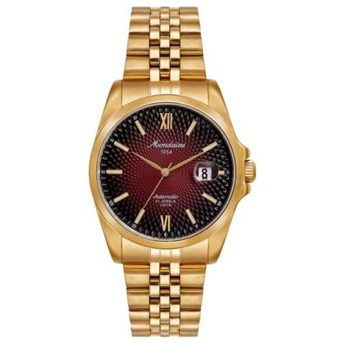 Mecanismo: Automático Miyota Japan 8215 (reserva de marcha 42h) Gênero: Masculino Visor: Vermelho texturizado com efeito fade Vidro: Cristal Mineral Funções: Automático e Calendário Prova d'água: 100m Diâmetro da caixa: 40 mm Largura da pulseira: 18 mm Tamanho do Vidro: 36 mm Característica: Fundo Rosqueado, coroa assinada, 21 joias. Garantia: 12 meses pelo fabricante Mondaine