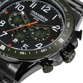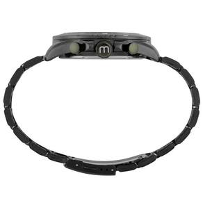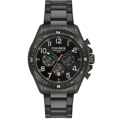 Com um visual moderno e impactante, este cronógrafo masculino da Mondaine aposta no contraste do acabamento preto fosco com a pulseira em aço preto, mantendo um estilo urbano e sofisticado.A caixa de 48 mm em metal proporciona presença no pulso, enquanto o mostrador escuro com números e indexes bem marcados favorece a leitura.Com fundo rosqueado, fecho de acionamento lateral e resistência à água de 5 ATM, é a escolha certa para quem busca funcionalidade sem abrir mão do design.