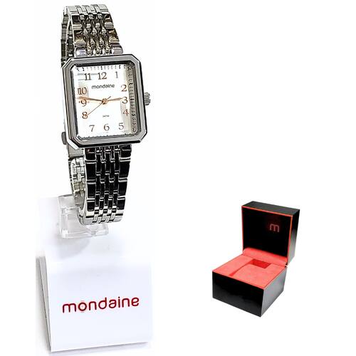 Marca: Mondaine Modelo: 32358L0MVNE2 Tipo de relógio: Analógico Gênero: Feminino Cor da caixa: Prateado Cor da pulseira: Prateado Estilo: Casual Alarme: Não Cronômetro: Não Calendário: Não Luz: Não Resistência à água: Sim – 3 ATM = 30 metros Tipo de fecho: Dobrável, com trava lateral Material da caixa: Aço Inoxidável Material da pulseira: Aço Inoxidável Características do vidro: Vidro mineral Tamanho da caixa (A x L): 30 x 27 mm Espessura da caixa: 7 mm Comprimento da pulseira: 22 cm Largura da pulseira: 9 mm Tampa do fundo: Pressão Peso: 66 Gramas Alimentação: Bateria Garantia do Fabricante: 12 meses Fabricante: Seculus da Amazônia Indústria e Com S/A