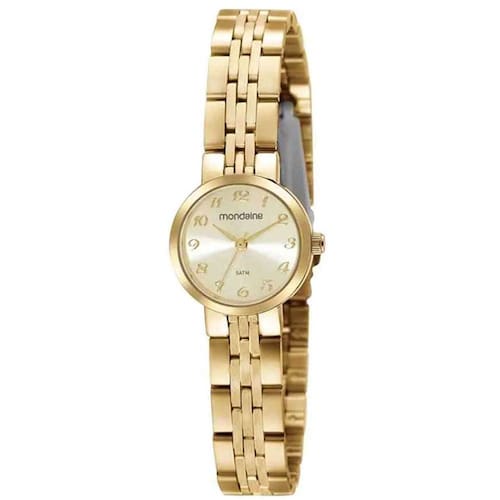 Características Formato do Relógio: Redondo Composição do Vidro: Cristal mineral Material da Caixa: Metal Cor da Caixa: Dourado Cor do mostrador: Dourado Material da Pulseira: Aço Inox Cor da Pulseira: Dourado Mecanismo: Analógico Quartz