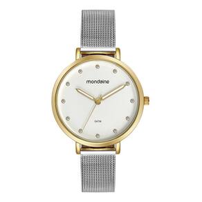 Relogio Mondaine Feminino Ref: 32847lpmvbe1 Casual Mesh Bicolor DESCRIÇÃO DO PRODUTO: Caixa de Metal Pulseira de Malha de Aço Mesh Vidro de Cristal Mineral Fundo Rosqueado Resistente à Água 5 Atm Diâmetro / Largura da Caixa: 36.00 MM Função: Analógico Alimentação do Maquinário: Bateria Mostrador Prateado com Pedras Prateado com Dourado de 1 Ano Marca: Não Informado Ean: 7909669182177