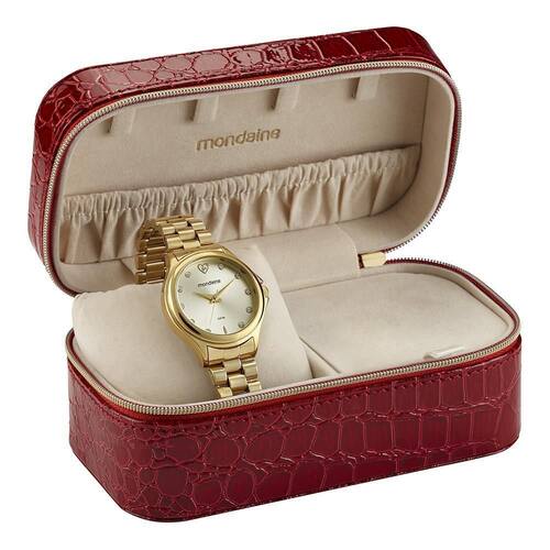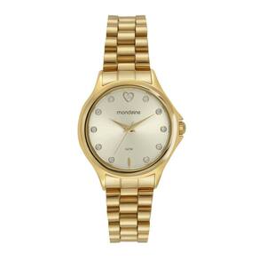 Relogio Mondaine Feminino Ref: 99761lpmvde1 Dourado Estojo Porta Joias DESCRIÇÃO DO PRODUTO: Caixa de Metal Pulseira de Aço Vidro de Cristal Mineral Fundo Rosqueado Resistente à Água 5 Atm Diâmetro / Largura da Caixa: 34.00 MM Função: Analógico Alimentação do Maquinário: Bateria Mostrador Prateado com pedras e detalhe de coração + Estojo Porta Joias de 1 Ano Marca: Não Informado