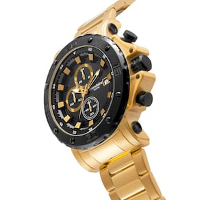 Características Formato do Relógio: Redondo Composição do Vidro: Cristal Mineral Material da Caixa: Aço Inox Cor da Caixa: Dourado Cor do mostrador: Preto Material da Pulseira: Aço Inox Cor da Pulseira: Dourado Mecanismo: Analógico - Multifunção