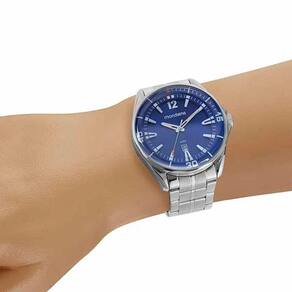 Características Formato do Relógio: Redondo Composição do Vidro: Cristal mineral Material da Caixa: Metal Cor da Caixa: Prata Cor do mostrador: Azul Material da Pulseira: Aço Inox Cor da Pulseira: Prata Mecanismo: Analógico Quartz