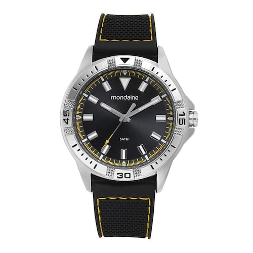 Relogio Mondaine Masculino Ref: 99787g0mvni3 Esportivo Prateado DESCRIÇÃO DO PRODUTO: Caixa de Metal Pulseira de Silicone Preta Vidro de Cristal Mineral Fundo Rosqueado Resistente à Água 5 Atm Diâmetro / Largura da Caixa: 48.00 MM Função: Analógico Mostrador Preto com detalhes em amarelo Alimentação do Maquinário: Bateria de 1 Ano Marca: Não Informado