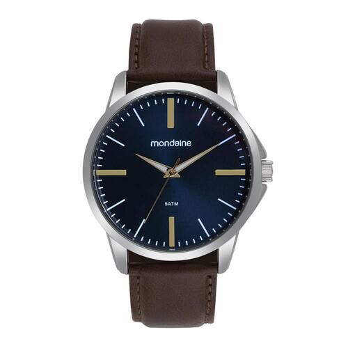 Relogio Mondaine Masculino Ref: 99788g0mvnh1 Casual Prateado DESCRIÇÃO DO PRODUTO: Caixa de Metal Pulseira de material sintético Marrom Vidro de Cristal Mineral Fundo Rosqueado Resistente à Água 5 Atm Diâmetro / Largura da Caixa: 44.00 MM Função: Analógico Mostrador Azul com detalhes em dourado Alimentação do Maquinário: Bateria de 1 Ano Ean: 7909669198956