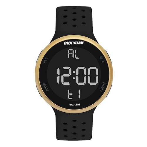 Relógio Mormaii Digi Unissex Dourado Mo7700ab/8d Mo7700ab/8d Relógio Mormaii Digi unissex, digital, redondo, com caixa em polímero dourado e pulseira de silicone preto. O modelo apresenta display negativo e resistência à água em até 10 ATM. Ref. MO7700AB/8D. Modelo_ML - Relógio Mormaii Digi Unissex Dourado MO7700AB/8D