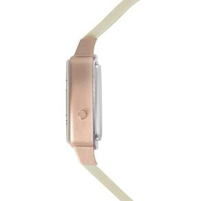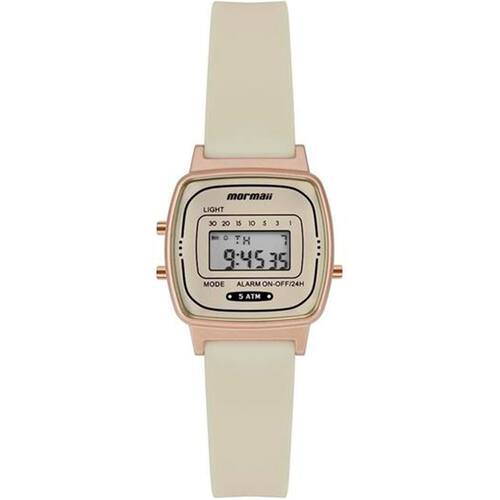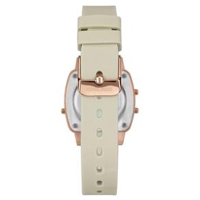 Características Formato do Relógio: Retangular Composição do Vidro: Acrílico Material da Caixa: Resina Cor da Caixa: Bege, Rosê Cor do mostrador: Digital, Bege Material da Pulseira: Borracha Cor da Pulseira: Bege Mecanismo: Analógico-Digital