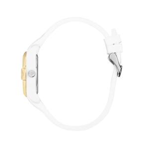 O diferencial está na moldura dourada com detalhe exclusivo do logo Mormaii sobre a coroa, que adiciona personalidade ao design clean. A pulseira em silicone branco traz conforto e versatilidade para o uso diário, enquanto a resistência à água de 5 ATM permite o uso em atividades leves com contato com a água.