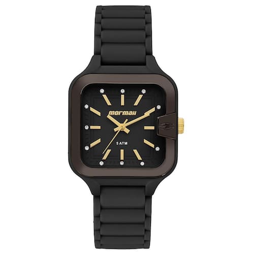 Com caixa quadrada de 34mm, o modelo se destaca pelo contraste entre o mostrador preto com marcadores e ponteiros dourados e a pulseira em silicone preto, que proporciona conforto e resistência. Detalhes em cristais delicados ao redor do mostrador adicionam um toque sutil de brilho e sofisticação.