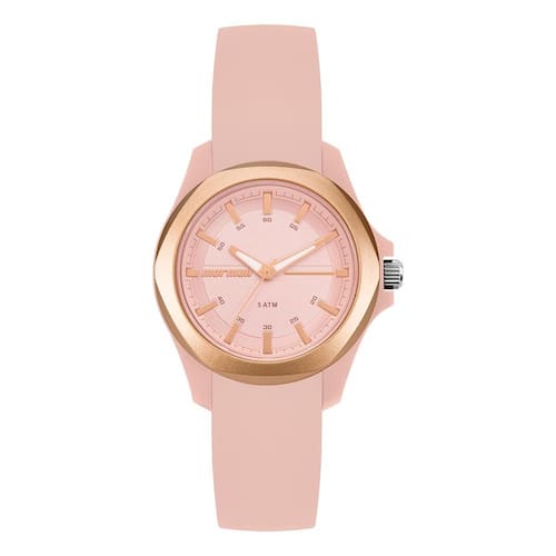 O mostrador rosé com marcadores minimalistas e ponteiros também em tom dourado garante uma leitura fácil e elegante. A pulseira em silicone rosa completa o design, oferecendo suavidade ao toque e excelente ajuste ao pulso.