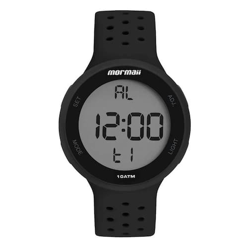 RELÓGIO MORMAII MO7700AG/8P Linha: Digi Garantia: 12 meses em toda rede autorizada Mormaii Conteúdo da embalagem: 1 relógio, manual, certificado de garantia Fornecedor: Technos Indústria e Comércio da Amazônia S/A Características: Vidro: Acrílico Material da caixa: Polímero Cor da caixa: Preto Material da pulseira: Silicone Cor da pulseira: Preto Diâmetro da caixa: 4,3 cm Cor do mostrador: Digital LCD Positivo Mecanismo: Digital Funções: Calendário / Hora Resistência à água : 10 ATM / Consulte sempre o manual antes de molhar seu relógio Relógio Mormaii Digi com caixa preta de polímero 43mm e pulseira preta de silicone, que deixam o relógio leve e confortável. O mostrador LCD positivo facilita a leitura das horas e a resistência à água de 100 metros o transforma no parceiro ideal para qualquer momento