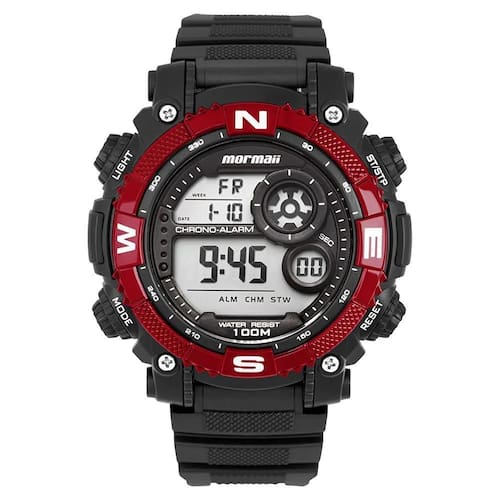 Seu aro em vermelho metálico dá um toque de destaque e personalidade ao relógio, contrastando com a estrutura preta. O mostrador digital exibe funções completas, como cronômetro, alarme, calendário e iluminação em LED tudo pensado para facilitar o uso no dia a dia e em práticas esportivas.