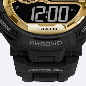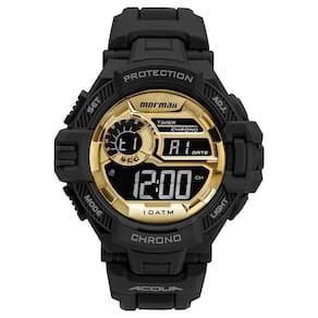 Relógio Mormaii masculino Action MO1134AC/8D à prova dágua 10ATM. Aro metalizado dourado. Modelo digital com pulseira e caixa de polímero preto. Caixa de 54mm.