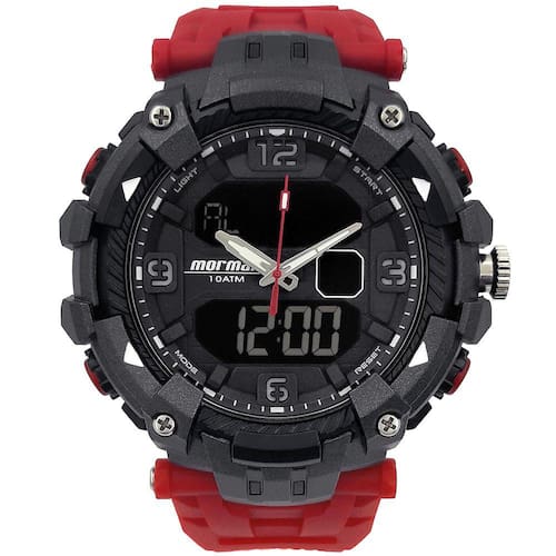 Características Formato do Relógio: Redondo Composição do Vidro: Acrílico Material da Caixa: Resina Cor da Caixa: Preto Cor do mostrador: Digital, Preto Material da Pulseira: Borracha Cor da Pulseira: Vermelho Mecanismo: Analógico-Digital