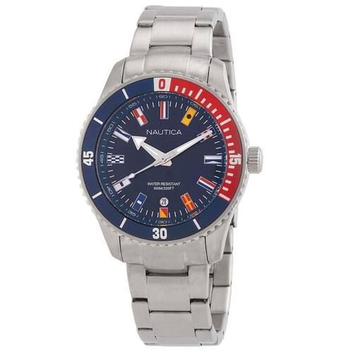 Caixa e pulseira de aço inoxidável em tom prateado. Bezel de aço inoxidável azul e vermelho. Mostrador azul com ponteiros em tom prateado e marcadores de horas em formato de bandeiras. Marcadores de minutos ao redor da borda externa. Tipo de mostrador: analógico. Exibição de data na posição das 6 horas. Movimento de quartzo. Cristal mineral resistente a riscos. Tampa traseira sólida. Caixa redonda, tamanho da caixa: 44 mm, espessura da caixa: 12 mm. Largura da pulseira: 22 mm. Fecho de implantação com botão de liberação. Resistente à água até 100 metros / 330 pés. Funções: data, hora, minuto, segundo. Série Pacific Beach. Estilo de relógio esportivo. Etiqueta do relógio: Movimento Japonês. Relógio masculino Nautica Pacific Beach Quartz com mostrador azul, modelo NAPPBS022. Marca: Não Informado