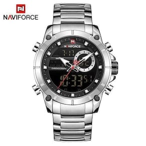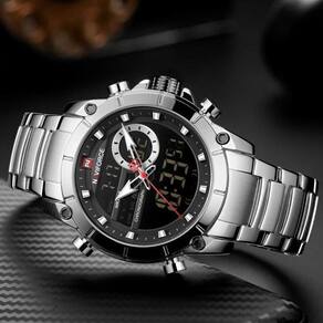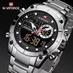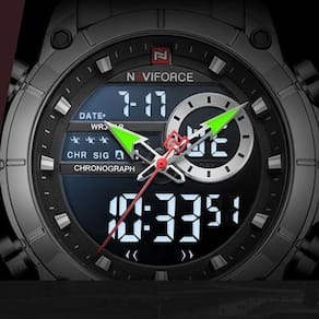 Com um mostrador analógico e digital, o modelo 9163 da Naviforce possui diversas funcionalidades que o tornam versátil e útil em diversas situações. Ele é resistente à água, suportando contatos acidentais com água ao lavar as mãos e tomar chuva, porém não é adequado para banhos ou mergulhos.
