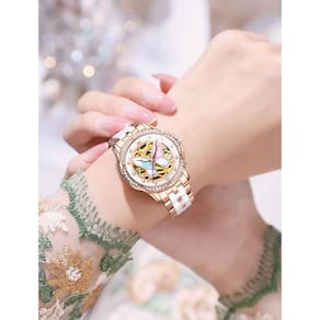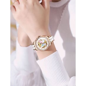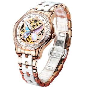 OLEVS Relógio feminino automático, relógio feminino premium, grande, com detalhes em diamante, com corda automática, moda à prova d'água, pulseira de cerâmica de aço inoxidável de dois tons, - Design luxuoso e refinado: inspirado na linda borboleta, este relógio feminino apresenta um mostrador esqueleto delicado e colorido em uma caixa arredondada em ouro rosa e acabamento com diamantes de corte brilhante — um acessório definitivo para a mulher que aprecia sofisticação simples e elegância atemporal. - Relógio de cerâmica para mulheres: pulseira de aço inoxidável e cerâmica com fecho dobrável, fácil de usar e ainda oferece excelente conforto. Também fornecemos elos extras para você se a pulseira for muito curta. - Relógio automático feminino: não precisa mais bateria - a energia é gerada automaticamente pelo movimento do seu braço. Para manter o relógio funcionando com precisão, recomendamos que você o use 8 horas ou mais por dia. Se o seu relógio parar completamente, gire a coroa no sentido horário 30 voltas (ou até sentir resistência). - Presente perfeito para mulheres: vem com uma linda caixa de presente, será um presente impressionante para o Natal, Dia dos Namorados, Dia das Mães, aniversário, aniversário e outras ocasiões especiais. Adequado para mãe, esposa, irmã, filha, namorada e entes queridos. Resistente à água até 30 m. Adequado para uso diário. - O que você recebe: Relógio feminino de cerâmica, boa caixa de relógio, pano de limpeza, ferramenta de remoção de elos, manual do usuário (sem garantia de versão em português). Sinta-se à vontade para entrar em contato conosco se houver algum problema. nossa equipe de pós-atendimento oferecerá uma solução satisfatória dentro de 24 horas.