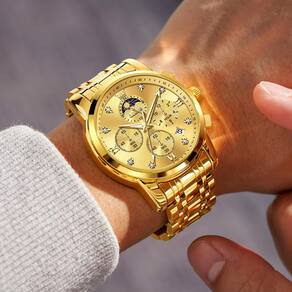 Relógio masculino dourado de luxo com fases da lua, analógico, casual, aço inoxidável, à prova d'água, luminoso, conjunto de relógios de pulso para homens - Relógio masculino OLEVS Luxuoso: este relógio masculino OLEVS é um relógio de mostrador grande com um diâmetro de caixa de 41,5 mm / 1,63 polegadas, circunferência máxima: 210 mm / 8,26 polegadas, este relógio cronógrafo multifuncional combina com roupas de negócios, dando um visual cavalheiro. Movimento importado, fornece horário preciso e preciso. Lente de vidro cristal, caixa e pulseira de aço inoxidável, durável e confortável para uso diário - Relógio multifuncional para homens: design clássico de 7 mostradores manuais, 5 funções de tempo meticulosamente projetadas para atender OLEVS todas as necessidades do cliente, um relógio multifuncional com várias vezes. Pulseira de relógio de aço inoxidável sólida, botão de borboleta oculta, ventilar, evitar transpiração, garantia de qualidade. Vem como um bônus de ferramentas de ajuste fornecidas para ajustar facilmente o comprimento da pulseira - Relógio de pulso à prova d'água/luminoso: resistente à água até 30 m, pode suportar respingos ou breve imersão em água, mas não é adequado para nadar ou tomar banho. Após forte exposição à luz, a função luminosa do relógio pode ser ativada, permitindo que você cronometre com precisão mesmo em ambientes escuros - Presente perfeito para relógio: este relógio de pulso de luxo elegante pode ser utilizado em uma variedade de ocasiões, seja formal, comercial ou casual, ou em eventos internos, externos ou uso diário. Embalado em uma caixa requintada, este relógio elegante e luxuoso é um presente ideal para você, amigos, colegas de classe, amantes, família para formaturas, Natal, aniversários, dia dos pais, dia dos namorados, etc - Serviço pós-venda: cada relógio de pulso tem serviço de vendas. Se você tiver alguma dúvida sobre o produto, comigo imediatamente e lhe daremos uma solução satisfatória