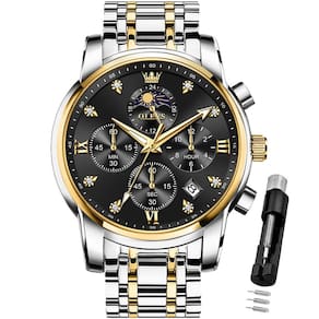 Relógios masculinos luxuosos, analógicos, fases da lua, casual, relógio masculino, clássico, aço inoxidável, à prova d'água, luminoso, calendário, relógio de pulso, preto - Relógio masculino OLEVS Luxuoso: este relógio masculino OLEVS é um relógio de mostrador grande com um diâmetro de caixa de 41,5 mm / 1,63 polegadas, circunferência máxima: 210 mm / 8,26 polegadas, este relógio cronógrafo multifuncional combina com roupas de negócios, dando um visual cavalheiro. Movimento importado, fornece horário preciso e preciso. Lente de vidro cristal, caixa e pulseira de aço inoxidável, durável e confortável para uso diário - Relógio multifuncional para homens: design clássico de 7 mostradores manuais, 5 funções de tempo meticulosamente projetadas para atender OLEVS todas as necessidades do cliente, um relógio multifuncional com várias vezes. Pulseira de relógio de aço inoxidável sólida, botão de borboleta oculta, ventilar, evitar transpiração, garantia de qualidade. Vem como um bônus de ferramentas de ajuste fornecidas para ajustar facilmente o comprimento da pulseira - Relógio de pulso à prova d'água/luminoso: resistente à água até 30 m, pode suportar respingos ou breve imersão em água, mas não é adequado para nadar ou tomar banho. Após forte exposição à luz, a função luminosa do relógio pode ser ativada, permitindo que você cronometre com precisão mesmo em ambientes escuros - Presente perfeito para relógio: este relógio de pulso de luxo elegante pode ser utilizado em uma variedade de ocasiões, seja formal, comercial ou casual, ou em eventos internos, externos ou uso diário. Embalado em uma caixa requintada, este relógio elegante e luxuoso é um presente ideal para você, amigos, colegas de classe, amantes, família para formaturas, Natal, aniversários, dia dos pais, dia dos namorados, etc - Serviço pós-venda: cada relógio de pulso tem serviço de vendas. Se você tiver alguma dúvida sobre o produto, comigo imediatamente e lhe daremos uma solução satisfatória