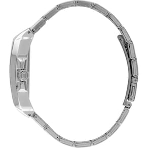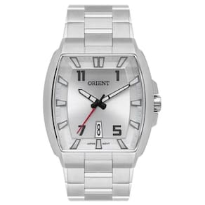 Descrição do produto Formato do Relógio Quadrado / Retangular Gênero Masculino Estilo Fashion Tipo de Mecanismo Analógico Caixa do Relógio Aço Inox Cor Predominante do Relógio Prateada Cor da Pulseira Prateada Cor do Mostrador Prata Tipo de Pulseira Aço Inox Modelo Mostrador Relógio Apenas cifras, Numeros grandes Tipo de Vidro Cristal Mineral Funções Calendario Resistência a Água 5ATM Medidas do Relógio 39mm