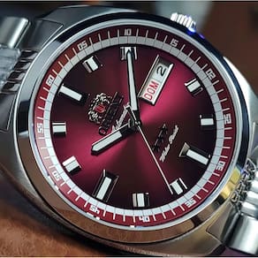 Funções: hacking, enrolamento manual, calendário duplo, mostrador sunray